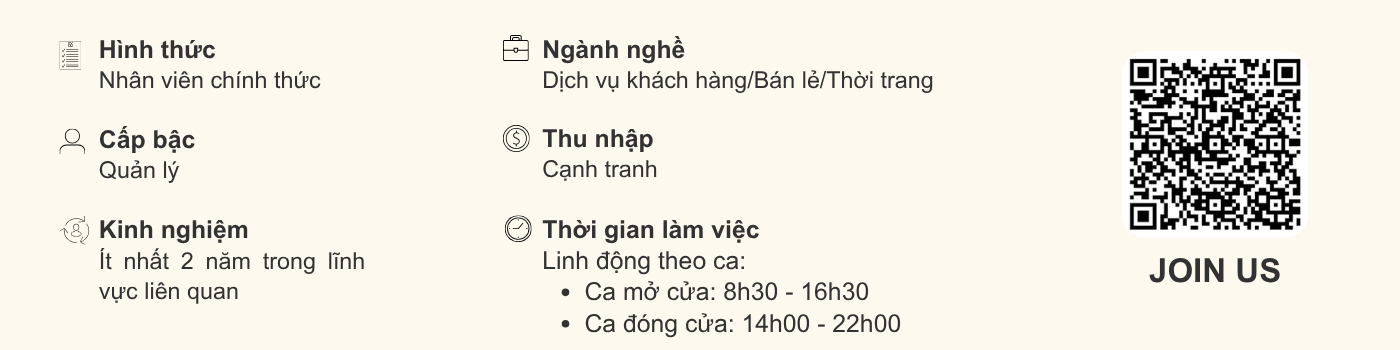 - Có tối thiểu 2 năm kinh nghiệm ở vị trí quản lý bán lẻ tương tự (ưu tiên ngành thời trang hoặc chuỗi bán lẻ)
